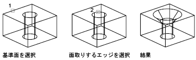 FILLETEDGE[フィレット エッジ]および CHAMFEREDGE[面取りエッジ]コマンドを使用して、3D ソリッドのエッジを丸めたり、フィレットしたり、斜めに切り取ります。
