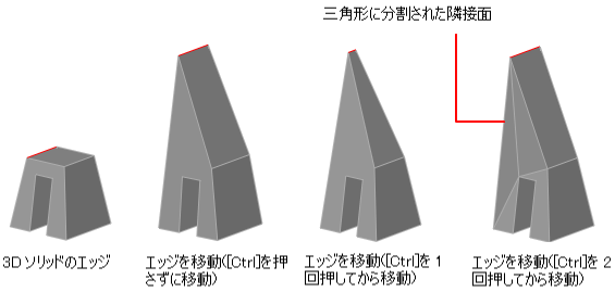 MOVE[移動]、ROTATE[回転]、SCALE[尺度変更]コマンドを使用して、他のオブジェクトに対して行うようにして 3D ソリッドと 3D サーフェスのエッジを修正できます。[Ctrl]を押しながらエッジを選択します。