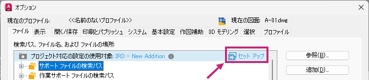 注: [セット アップ]オプションが表示されない場合は、プロジェクトが既に設定済みである可能性があります。これは、「現在の図面はプロジェクト対応の設定を使用しています」というテキストが表示されることで確認できます。