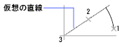 始点(1)から反時計回りに、中心点(3)と 2 点目(2)を通る仮想の直線との交点(終点)まで円弧が描かれます。