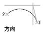 指定した方向の直線に接する円弧が描かれます。始点(1)から始まり終点(2)で終わる長い円弧または短い円弧を、時計回りまたは反時計回りに描くことができます。方向は、始点を基準にして決まります。