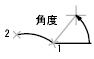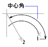 始点(1)から終点(2)まで反時計回りに、指定した中心角の円弧が描かれます。負の角度を指定すると、円弧は時計回りに描かれます。