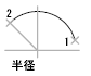 始点(1)から終点(2)まで、反時計回りの短い円弧が描かれます。負の半径を指定すると、長い円弧が描かれます。