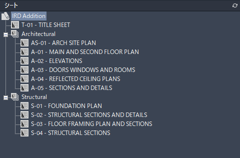 - シート サブセットは、多くの場合、建築設計や機械設計などの分野に関連付けて作成します。たとえば、建築設計では Structural という名前のサブセットを使用し、機械設計では Standard Fasteners という名前のサブセットを使用することがあります。また、サブセットは、場合によってはレビュー状態や完成状態に関連付けて作成すると便利なこともあります。サブセットは、必要に応じて他のサブセットにネストできます。シートやサブセットを作成したり読み込んだ後は、ツリー表示でドラッグすることによって順序を簡単に変更できます。