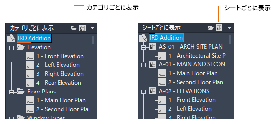 - ビュー カテゴリは、多くの場合、各分野で使用される図面の種類に関連付けて作成します。たとえば、建築設計では Elevations というビュー分類を使用し、機械設計では Exploded というビュー分類を使用することがあります。ビューは、その位置する分類またはシートごとに表示できます。分類は、必要に応じて他の分類にネストできます。ビューを別の分類に移動するには、ツリー表示でドラッグするか、[カテゴリを設定]ショートカット メニューを使用します。