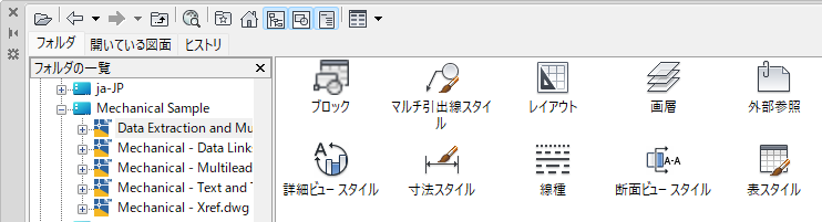 [フォルダ]、[開いている図面]、[ヒストリ]タブからは、いくつかの方法でコンテンツにアクセスできます。