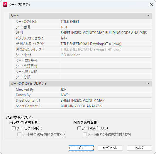 選択したシート固有の情報、たとえばシートのタイトル、シート番号、パブリッシュ処理に含めるかどうかなどが表示されます。カスタム プロパティがある場合には、これも表示されます。