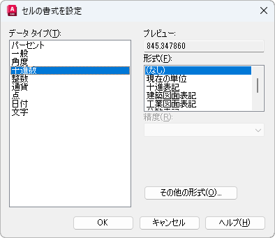 [角度]、[十進数]、[点]、[整数]に対してのみ、[その他の形式]ダイアログ ボックスが表示され、そこで表のセルに対するその他の形式を設定します。