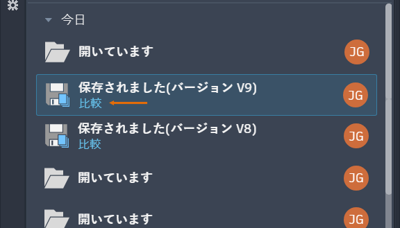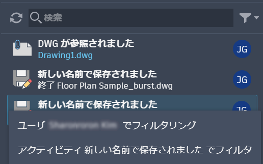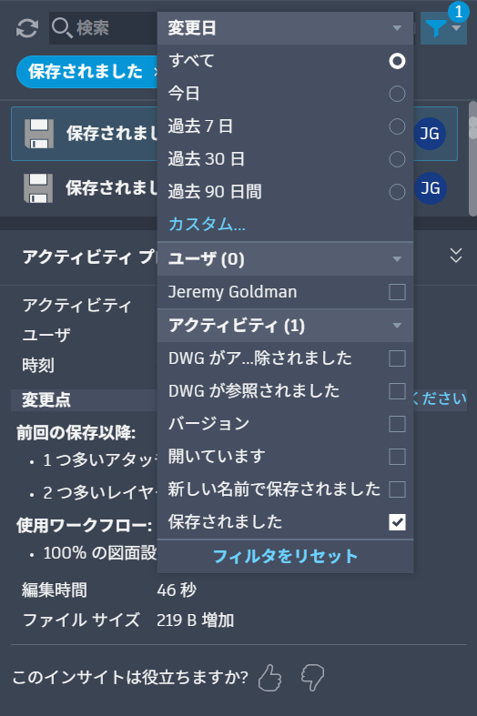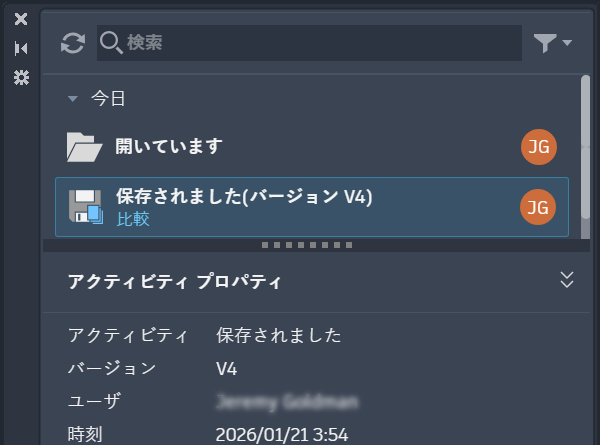 アクティビティ フィルタで[保存済み]を選択すると、バージョン アクティビティを選択表示できます。さらにフィルタするには、時刻フィルタおよびユーザ フィルタを使用します。