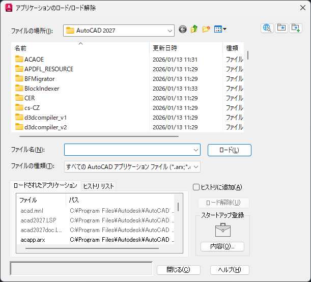 現在ロードされているアプリケーションが、(ファイル名によって)アルファベット順にリストされます。LISP ルーチンは、[アプリケーションのロード/ロード解除]ダイアログ ボックスを使用してロードしている場合にのみ、このリストに表示されます。