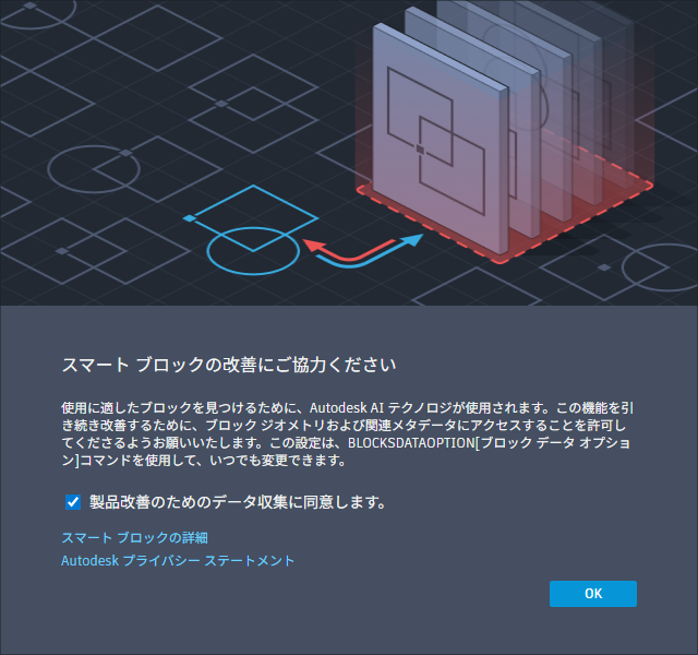 スマート ブロック ワークフローを初めて完了した後、[データ収集の同意]ダイアログ ボックスが表示されます。データ収集に同意すると、ワークフローで使用されるコンテンツ データが AutoCAD と共有されます。