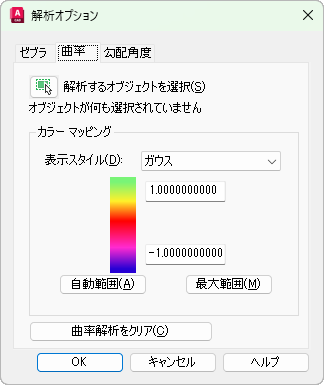 曲率解析対象として選択したすべてのオブジェクトの最大範囲と最小範囲を計算します。(システム変数 VSACURVATUREHIGH および VSACURVATURELOW)