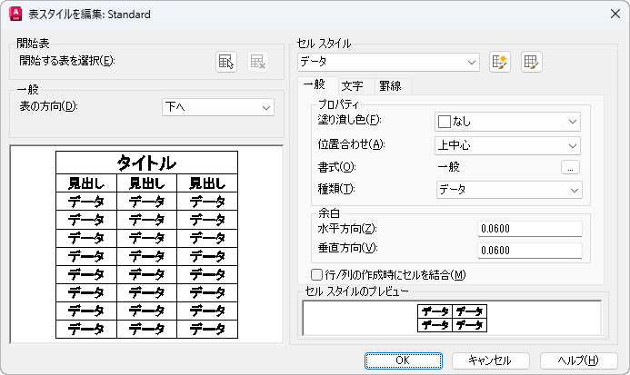 文字の高さを設定します。データ セルと列見出しセルの既定の文字の高さは 0.1800 です。表タイトルの既定の文字の高さは 0.25 です。