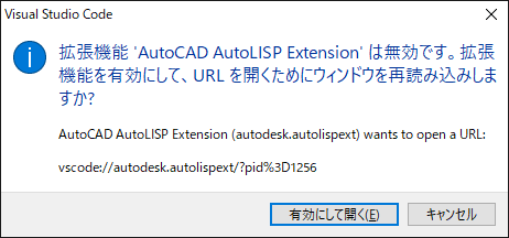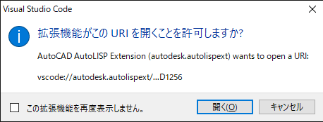 Visual Studio Code と AutoCAD AutoLISP Extension のインストールが完了するると、Visual Studio Code の起動時に、AutoCAD AutoLISP Extension がメッセージ ボックスを表示する URI を開くことを許可するように求められることがあります。表示される可能性のある最も一般的なメッセージは次のとおりです。