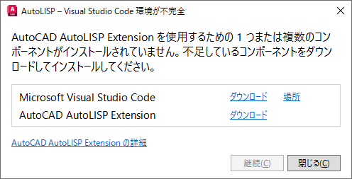 LISPSYS がゼロ以外の値に設定されている場合、AutoCAD は Visual Studio Code および AutoCAD AutoLISP Extension がインストールされているかどうかを確認します。Visual Studio Code がインストールされていない場合、次のメッセージ ボックスが表示されます。