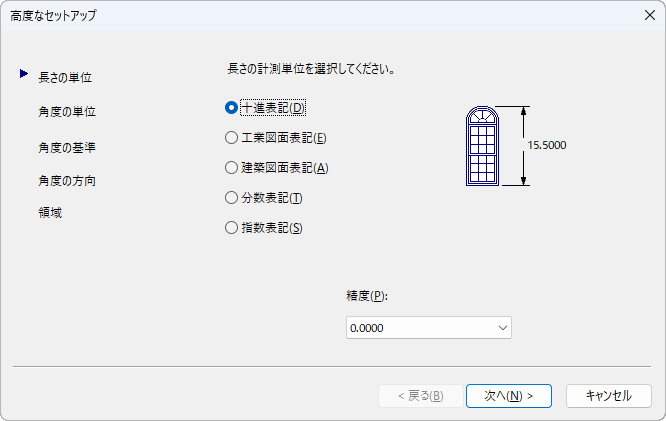 [高度なセットアップ]ウィザードには、[長さの単位]、[角度の単位]、[角度の基準]、[角度の方向]、[領域]の 5 つのページがあります。ウィザードの使用中は、[戻る]ボタンと[次へ]ボタンをクリックすると、ページを切り替えることができます。また、最後のページで[完了]ボタンをクリックすると、ウィザードを閉じて指定した設定に基づいて新しい図面を作成できます。