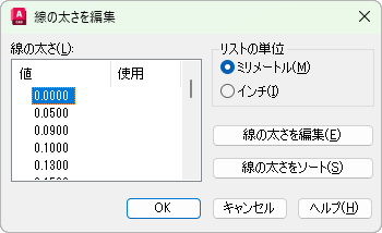 線の太さのリストを値でソートします。線の太さの値を変更した場合、[線の太さをソート]を選択するとリストがソートし直されます。