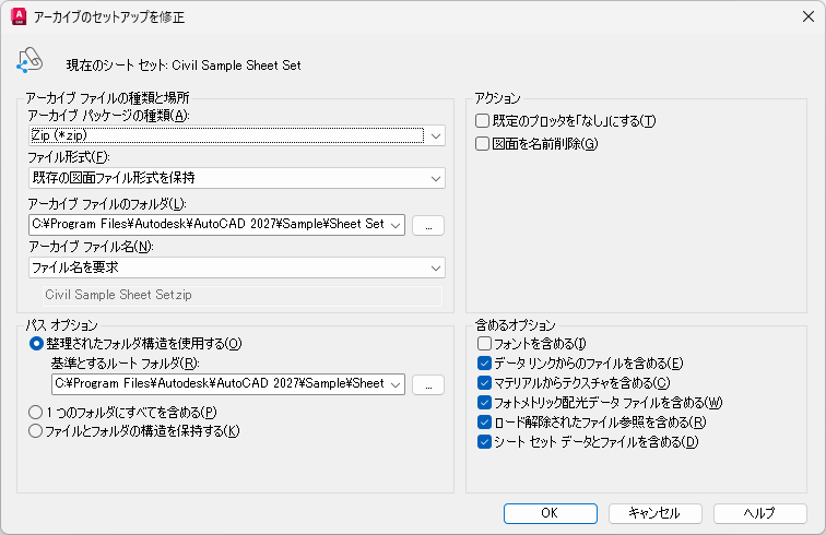 このボックスを空白のままにすると、アーカイブ ファイルはシート セット データ(DST)ファイルが存在するフォルダに作成されます。
