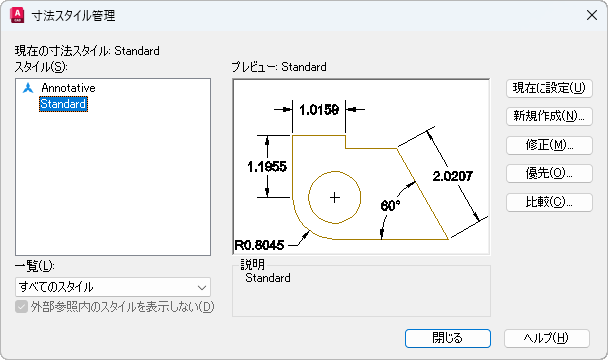 現在の寸法スタイルの名前が表示されます。既定の寸法スタイルは、Standard です。作成する寸法には現在のスタイルが適用されます。