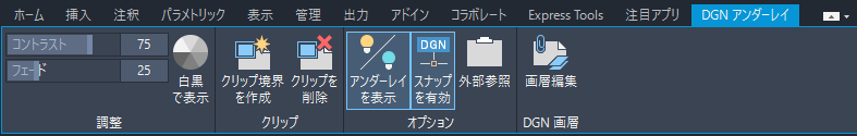 図面内の DGN アンダーレイを選択すると、[DGN アンダーレイ]コンテキスト タブがリボンに表示されます。