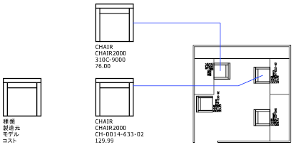 次の図に、種類、メーカー、モデル、価格の 4 つの属性を持つ椅子ブロックを示します。名称は変数として設定されたため、各ブロック参照の挿入時に、各インスタンスに関する固有の情報を追加できます。