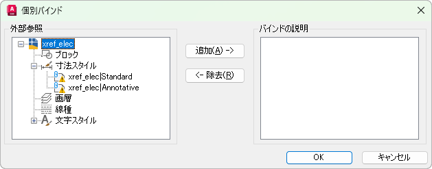 外部参照リストで選択した名前の付いたオブジェクトの定義を[バインドの説明]リストに移動します。