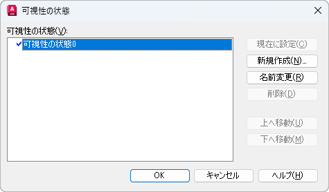 現在のダイナミック ブロック定義で使用できる可視性の状態がリストされます。このリストでの順番は、可視性の状態のリストを表示するためにグリップをクリックしたときにダイナミック ブロック参照で反映されます。リストの一番上に表示される状態は、ブロック参照の既定の状態です。