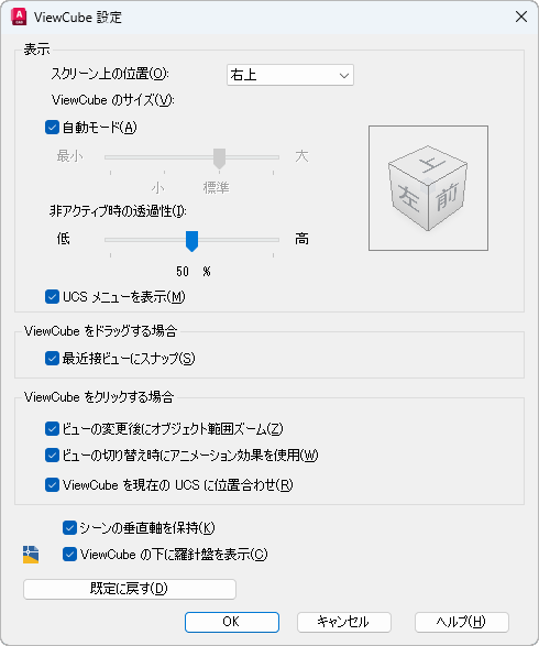 現在の設定に基づいて ViewCube のリアルタイム プレビューが表示されます。