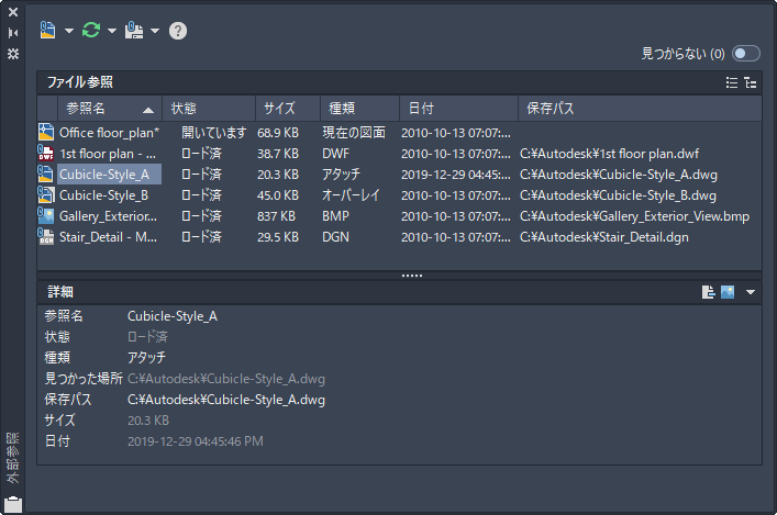 [ロードされていません]: 参照ファイルは、図面からロード解除されています。参照ファイルをロード解除すると、参照ファイルは表示されませんが、[再ロード]を使用して再表示することができます。