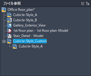 ツリー表示の最上位レベルには、常に現在の図面が表示されます。参照ファイルは次のレベルに表示されます。ネストされたファイル参照を含む参照ファイルは、開いて下位のレベルを表示できます。ツリー表示では、一度に 1 つのファイル参照しか選択できません。