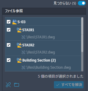 [アタッチされたすべての参照を表示]と[見つからない参照のみを表示]の状態を切り替えます。[見つからない参照のみを表示]が現在の状態になっている場合は、接続された参照のワークフローを使用して参照の新しいパスを手動で指定するか、Forma Data Management の Autodesk プロジェクトから開いたときに、現在の図面内の参照の推奨パスを受け入れることで、見つからない外部図面参照(XREF)のパスを更新できます。