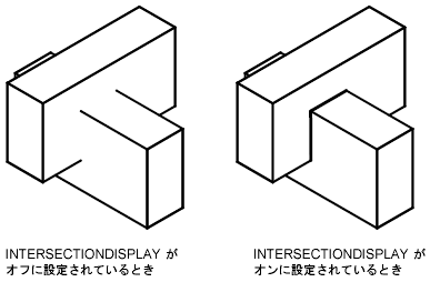システム変数 INTERSECTIONDISPLAY は、表示スタイルが 2D ワイヤフレームのみに設定されているときに、3D ソリッドおよびサーフェスの交差部分の表示をコントロールします。
