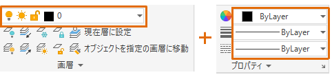 リボンの[ホーム]タブで、頻繁にアクセスするプロパティである画層、色、線の太さ、線種の設定を確認または変更するには、[画層]および[プロパティ]パネルを使用します。