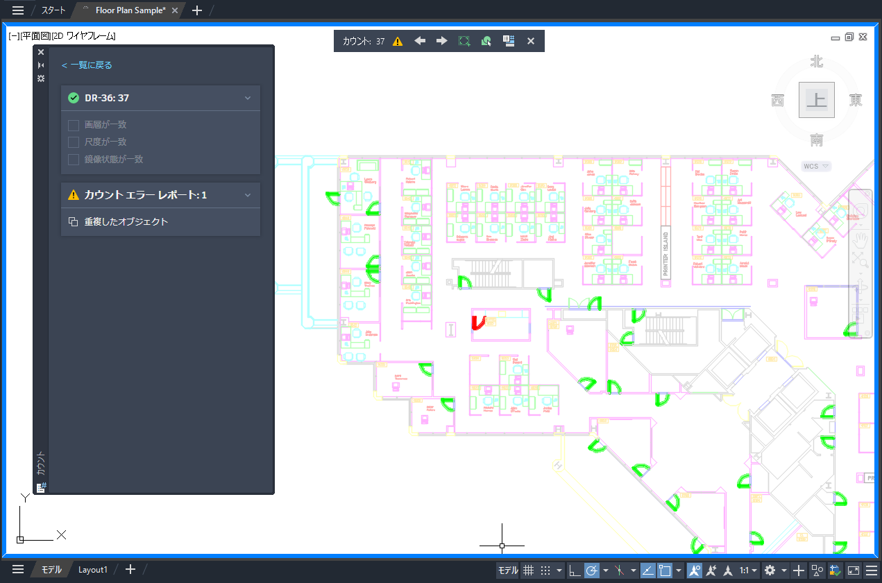 [カウント]パレットには、ブロック名とそれに対応する各ブロックの数が表示されます。アクティブなカウントを実行している場合、[カウント]パレットには、エラー レポート(存在する場合)を含むカウントの詳細が表示されます。レポートには、重なっているオブジェクト、分解されたオブジェクト、名前が変更されたオブジェクトなどのカウント エラーが一覧表示されます。カウント エラーをクリックすると、確認できるようにオブジェクトが拡大ズームされます。