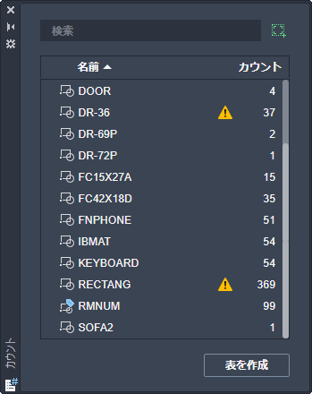 注: モデル空間に表示されているブロックのみが、[カウント]パレットに表示されます。