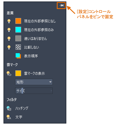[設定]パネルでは、外部参照比較結果でのハッチング オブジェクトおよび文字オブジェクトの違い、雲マーク、およびフィルタの表示方法をコントロールします。頻繁に変更する場合は、[設定]パネルをピン留めすると簡単にアクセスできます。