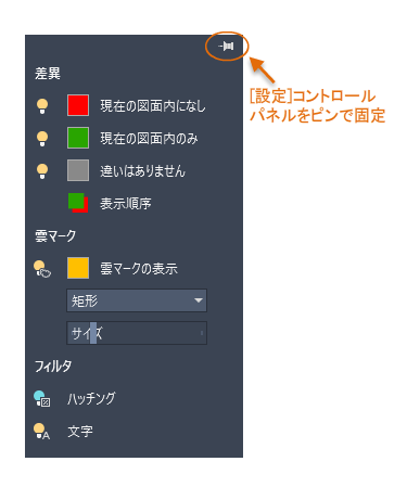 [設定]パネルでは、どのような種類の違いを表示するか、雲マークを表示するか、ハッチングまたは文字オブジェクトを表示するか、および使用する色をコントロールします。頻繁に変更する場合は、[設定]パネルをピン留めすると簡単にアクセスできます。明瞭になるように、次の図では見やすい色を使用しています。