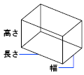 長さ、幅、高さの値を指定して直方体を作成します。長さ、幅、高さは、それぞれ X 軸、Y 軸、Z 軸に対応します。