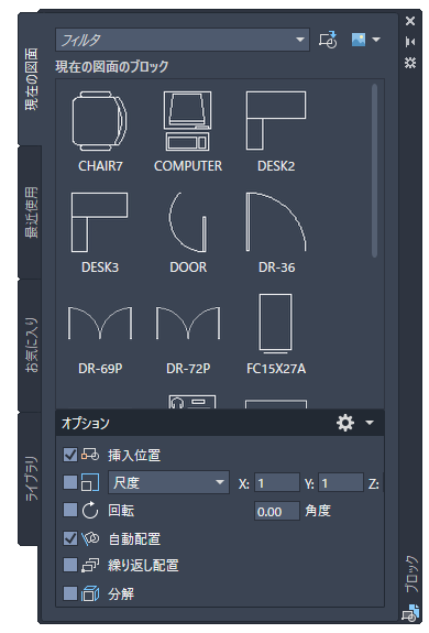 - ブロックをクリックして現在の図面に配置する。このメソッドは、[オプション]領域で指定した設定を適用します。