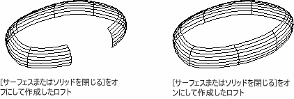 サーフェスまたはソリッドを閉じ、開きます。このオプションを使用するときは、ロフトされたサーフェスまたはソリッドが閉じたトーラスを形成できるように、断面はトーラス形状のパターンを形成している必要があります。(システム変数 LOFTPARAM)