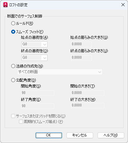 ロフトされたソリッドまたはサーフェスの最初と最後の断面の勾配角度と大きさをコントロールします。勾配角度は、サーフェスの開始方向です。0(ゼロ)は、曲線の平面から外側方向と定義されています。(システム変数 LOFTNORMALS)