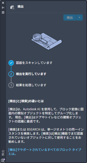 [検出]パレットには、図面をスキャンし、ブロックに変換するために特定したオブジェクトを確認するオプションが用意されています。