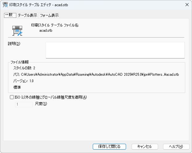 印刷スタイル テーブル ファイルの名前、説明、バージョン番号、保存場所(パス名)、テーブルのタイプが表示されます。