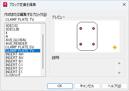 現在の図面に保存されているブロック定義のリストが表示されます。このリストからブロック定義を選択すると、[作成または編集するブロック]フィールドにその名前が表示されます。