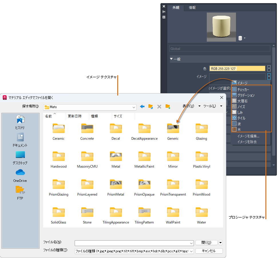 製品には、テクスチャで使用できるイメージのライブラリが用意されています。また、次のファイル タイプを使用して、独自のテクスチャを追加できます。