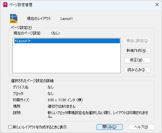 現在のページ設定が表示されます。別のページ設定を現在のページ設定にしたり、新しいページ設定を作成したり、既存のページ設定を修正したり、他の図面からページ設定を読み込みます。