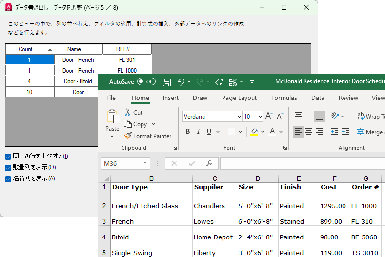 Excel スプレッドシートに保存されている情報を、書き出した「図面データ」(オブジェクトのプロパティ データ)とリンクして合成できます。上述の例で、さらに図面内のドアに関する追加情報(サプライヤと価格)が Excel スプレッドシート内にあるとします。データ書き出し時に、スプレッドシート内のサプライヤと価格の列を選択し、それらを他のデータと合成します。
