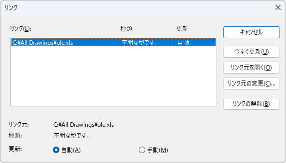 オブジェクトとソース ファイルとの間のリンクを断ち切ります。図面内のオブジェクトは、WMF(Windows メタファイル形式)に変更されます。したがって、ソース ファイルが変更されてもオブジェクトは影響を受けません。