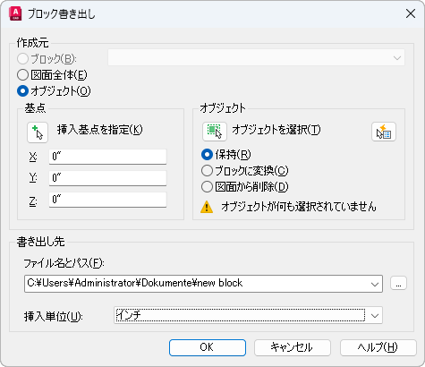 ブロックまたはオブジェクトを保存するファイル名とパスを指定します。