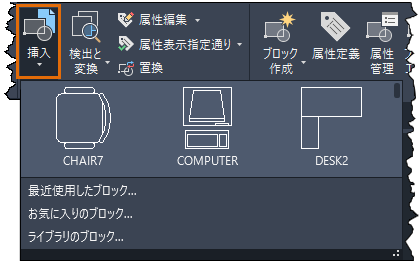 [ホーム]タブの[ブロック]パネルで[挿入]をクリックして、[ブロック]パレットを表示せずに現在の図面にブロック ギャラリを表示します。他の 2 つのオプション、[最近使用したブロック]と[ライブラリのブロック]は、対応するタブに[ブロック]パレットを表示します。